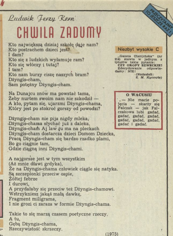 Archiwum / Rozmaitości nr 2059 (48/1984) 07/54 Podziel się Tytuł Chwila zadumy Autor Ludwik Jerzy Kern Rubryka Rozmaitości Artykuł z numeru 2059 (48/1984) Data wydania 25 listopada 1984 Tagi wiersz mongołowie Czyngis-chan Dżyngis-chan