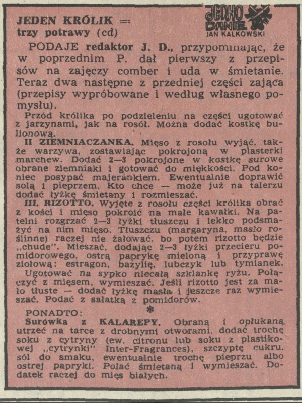 Archiwum / Jedno danie nr 2052 (41/1984) 84364/123969 Podziel się Tytuł Jedno danie Autor Jan Kalkowski Rubryka Jedno danie Artykuł z numeru 2052 (41/1984) Data wydania 7 października 1984