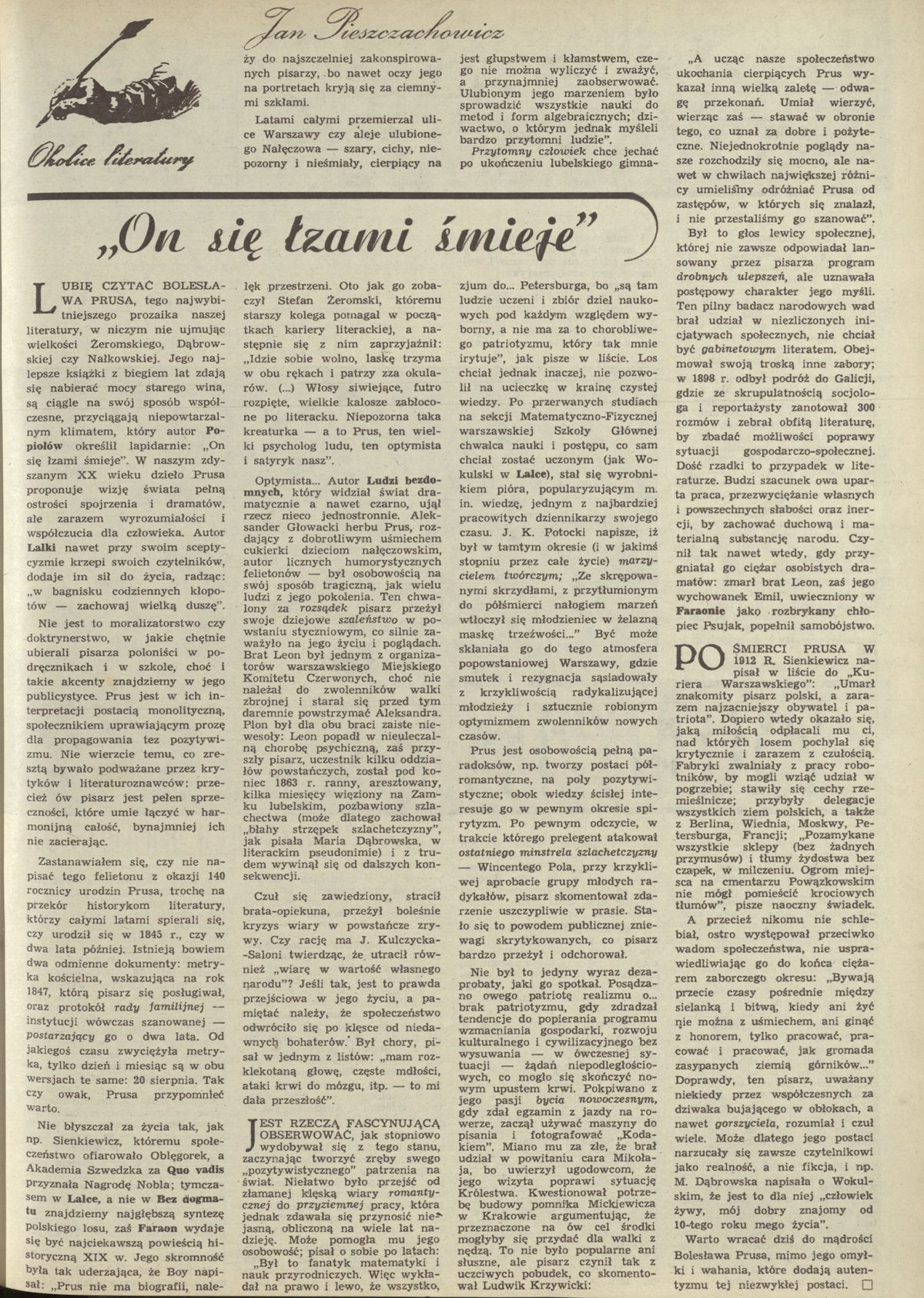Archiwum / Artykuł nr 2097 (33/1985) 10/14 Podziel się Tytuł On się łzami śmieje Autor Jan Pieszczachowicz Kategoria Artykuł Artykuł z numeru 2097 (33/1985) Data wydania 18 sierpnia 1985 Tagi okolice literatury Prus
