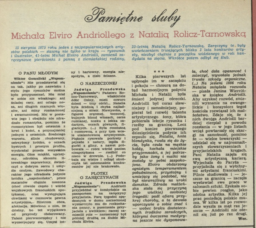 Archiwum / Różności nr 2097 (33/1985) 16/75 Podziel się Tytuł Pamiętne śluby Michała Elviro Andriollego z Natalią Rolicz-Tarnowską Autor Wer. Kategoria Różności Artykuł z numeru 2097 (33/1985) Data wydania 18 sierpnia 1985 Tagi ślub