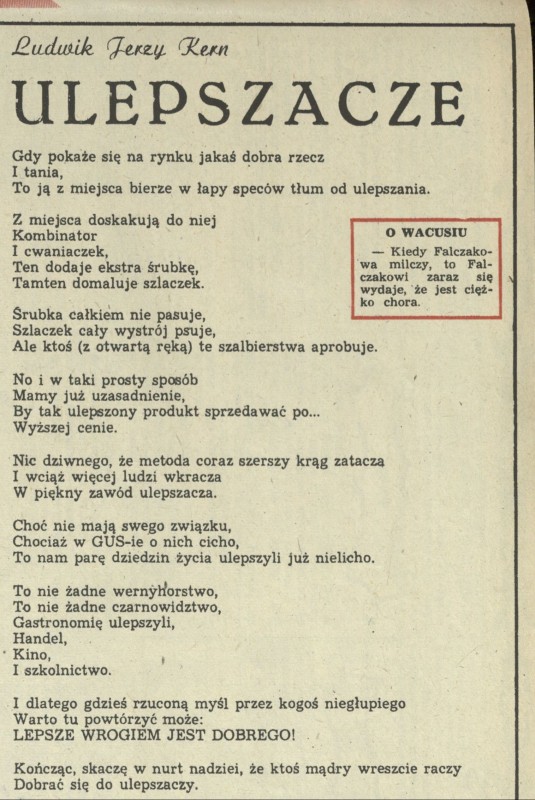 Archiwum / Rozmaitości [old] nr 2110 (46/1985) 89/98 Podziel się Tytuł Ulepszacze Autor Ludwik Jerzy Kern Rubryka Rozmaitości [old] Artykuł z numeru 2110 (46/1985) Data wydania 17 listopada 1985