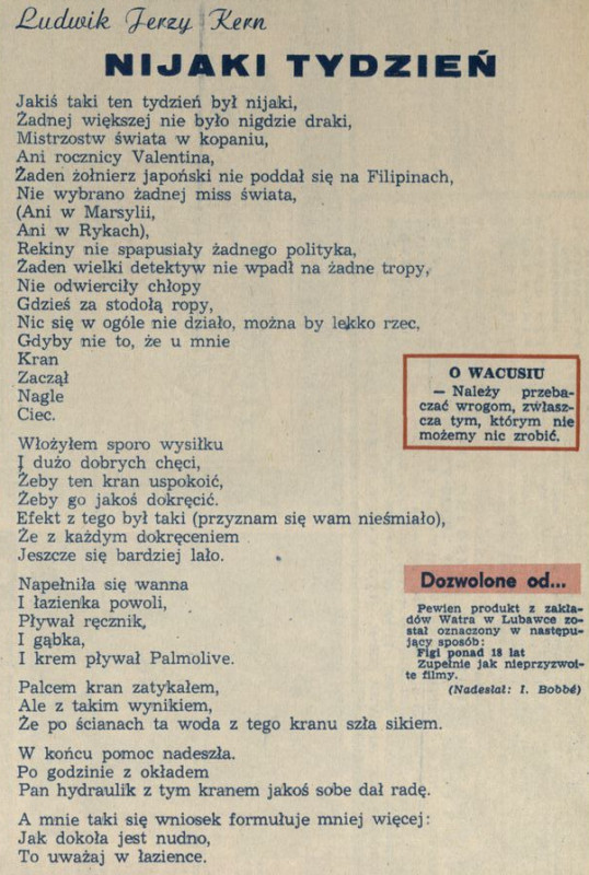 Archiwum / Rozmaitości nr 1559 (08/1975) 65688/123969 Podziel się Tytuł Nijaki tydzień Autor Ludwik Jerzy Kern Rubryka Rozmaitości Artykuł z numeru 1559 (8/1975) Data wydania 23 lutego 1975 Tagi wiersz łazienka