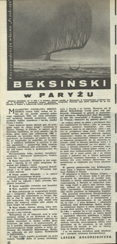 Archiwum / korespondencja własna "Przekroju" nr 2111 (47/1985) 1/7 Podziel się Tytuł Beksiński w Paryżu Autor Leszek Kołodziejczyk Rubryka korespondencja własna "Przekroju" Artykuł z numeru 2111 (47/1985) Data wydania 24 listopada 1985 Tagi sztuka malarstwo obraz kultura