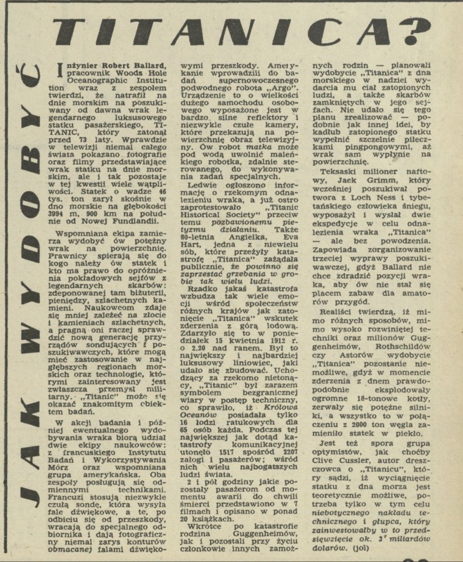 Archiwum / Artykuł nr 2113 (49/1985) 86704/123969 Podziel się Tytuł Jak wydobyć Titanica? Autor jol Kategoria Artykuł Artykuł z numeru 2113 (49/1985) Data wydania 8 grudnia 1985 Tagi Robert Balard wrak