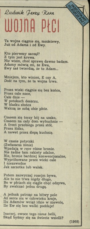 Archiwum / Rozmaitości [old] nr 2114 (50/1985) 96/98 Podziel się Tytuł Wojna płci Autor Ludwik Jerzy Kern Rubryka Rozmaitości [old] Artykuł z numeru 2114 (50/1985) Data wydania 15 grudnia 1985