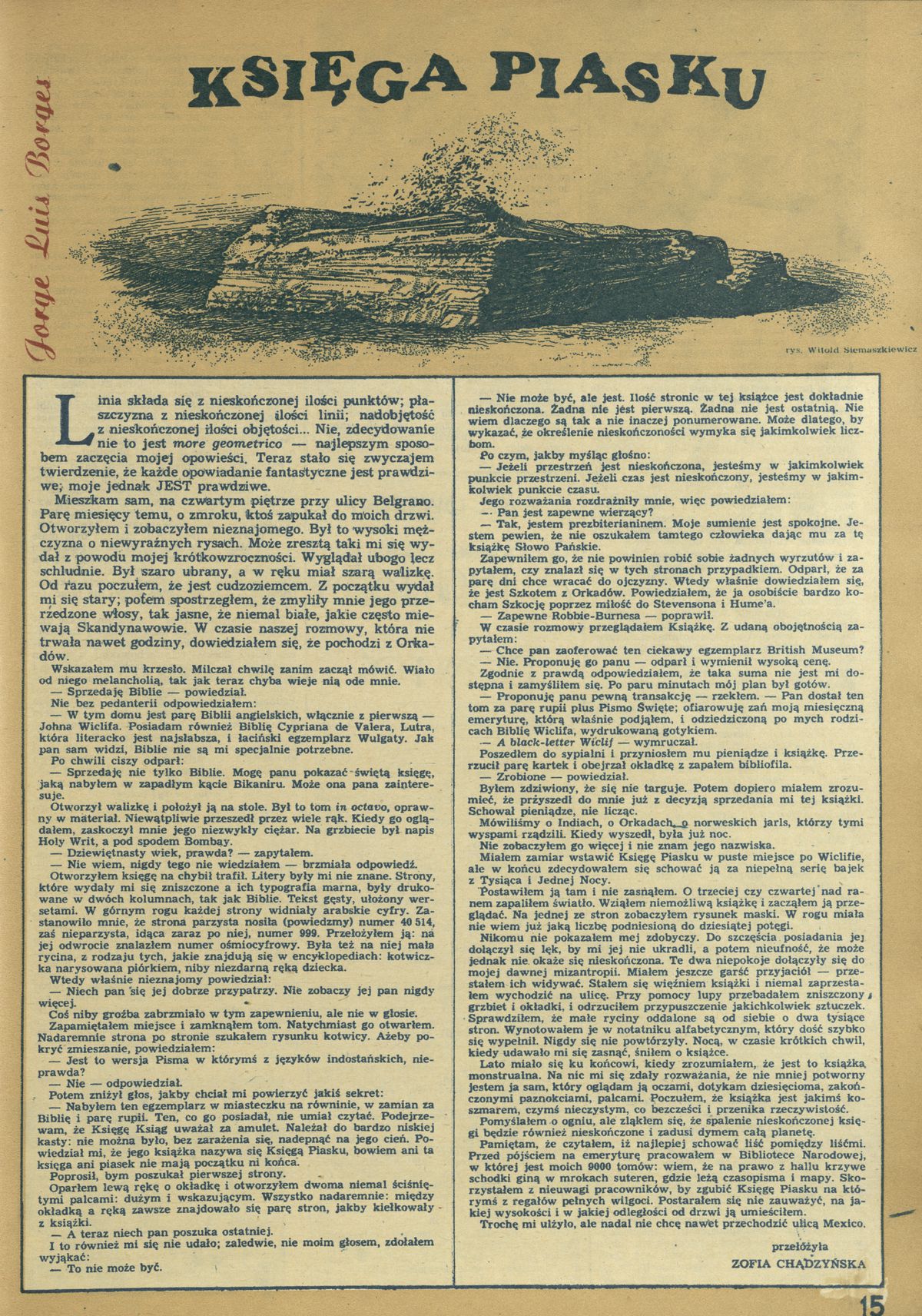 Archiwum / Opowiadanie nr 1800 (40/1979) 14/15 Podziel się Tytuł Księga piasku Autor Zofia Chądzyńska Kategoria Opowiadanie Artykuł z numeru 1800 (40/1979) Data wydania 7 października 1979