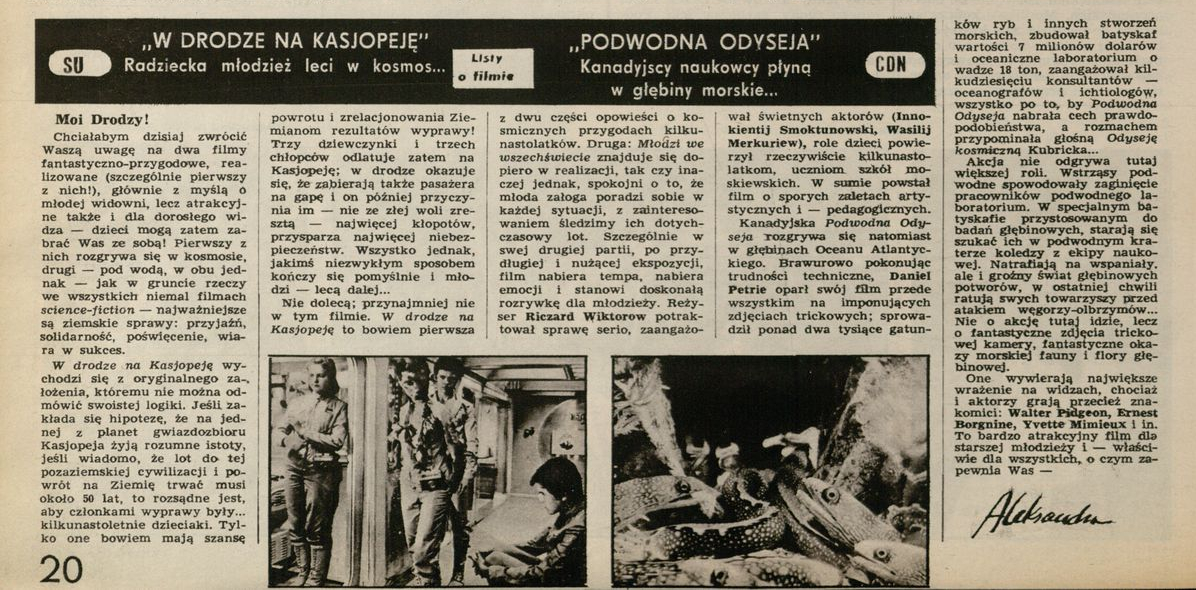 Archiwum / Listy o filmie nr 1560 (09/1975) 65739/123969 Podziel się Tytuł W drodze na Kasjopeję, Podwodna odyseja Autor Aleksandra Rubryka Listy o filmie Artykuł z numeru 1560 (9/1975) Data wydania 2 marca 1975 Tagi film kinematografia