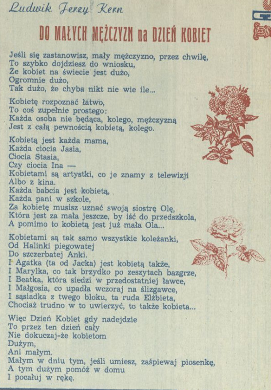 Archiwum / Rozmaitości nr 1561 (10/1975) 13/33 Podziel się Tytuł Do małych mężczyzn na Dzień Kobiet Autor Ludwik Jerzy Kern Rubryka Rozmaitości Artykuł z numeru 1561 (10/1975) Data wydania 9 marca 1975 Tagi wiersz dzień kobiet 8 marca kobiety