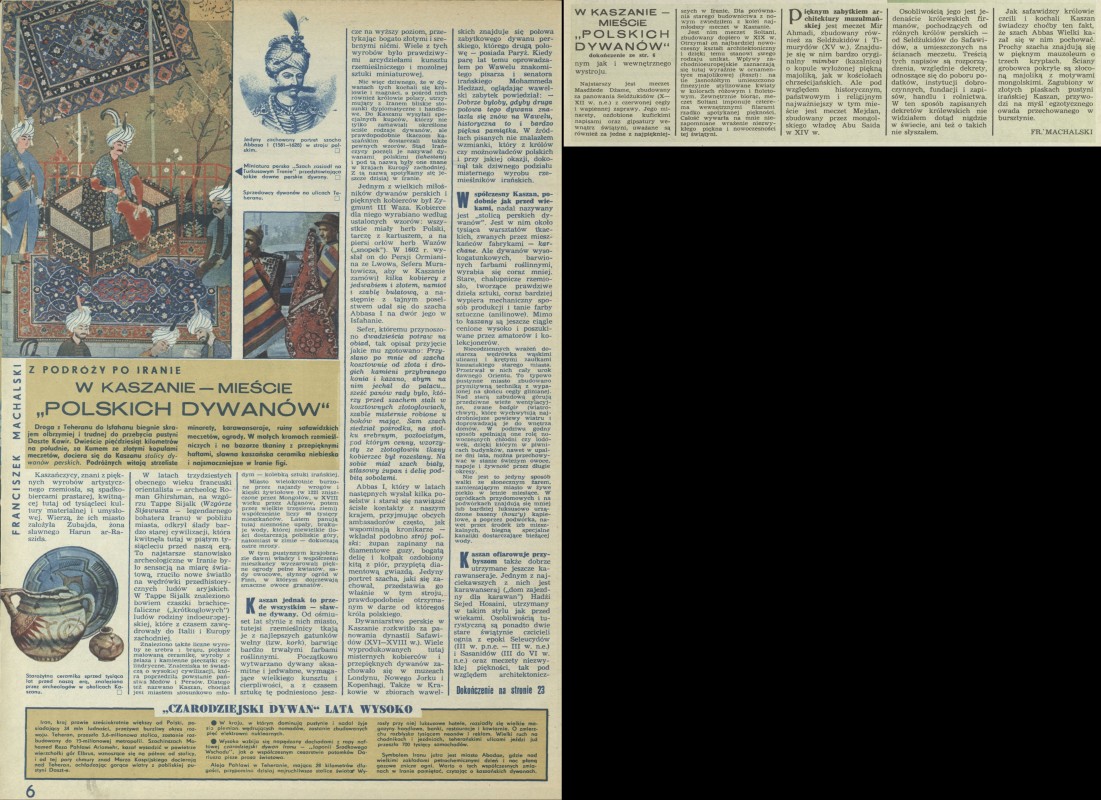 Archiwum / Reportaż nr 1562 (11/1975) 2/2 Podziel się Tytuł W Kaszanie – Mieście „polskich dywanów” Autor Franciszek Machalski Kategoria Reportaż Artykuł z numeru 1562 (11/1975) Data wydania 16 marca 1975 Tagi Kaszan Iran dywan
