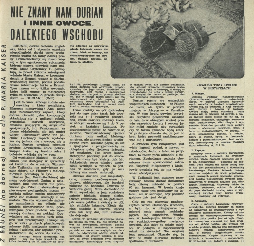 Archiwum / korespondencja własna "Przekroju" nr 2016 (05/1984) 2/2 Podziel się Tytuł Nie znany nam durian i inne owoce Dalekiego Wschodu Autor Maria Kaiser Rubryka korespondencja własna "Przekroju" Artykuł z numeru 2016 (5/1984) Data wydania 29 stycznia 1984 Tagi durian owoce