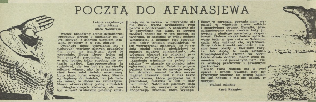 Archiwum / Pocztą od Afanasjewa nr 1575 (24/1975) 66457/123969 Podziel się Tytuł Pocztą od Afanasjewa Autor Jerzy Afanasjew Rubryka Pocztą od Afanasjewa Artykuł z numeru 1575 (24/1975) Data wydania 15 czerwca 1975