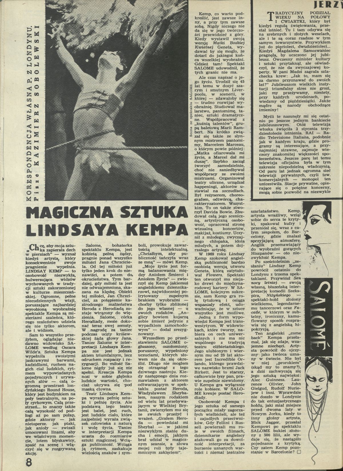 Archiwum / korespondencja własna "Przekroju" nr 2018 (07/1984) 535/807 Podziel się Tytuł Magiczna sztuka Lindsaya Kempa Autor Kazimierz Sobolewski Rubryka korespondencja własna "Przekroju" Artykuł z numeru 2018 (7/1984) Data wydania 12 lutego 1984 Tagi Salome spektakl