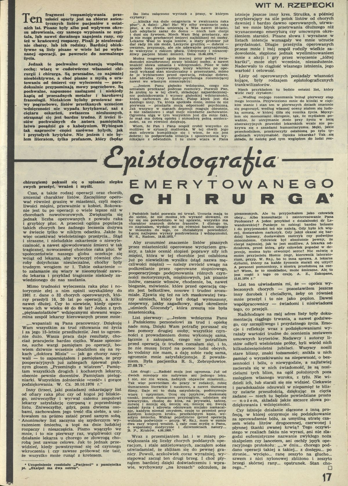 Archiwum / Artykuł nr 2018 (07/1984) 11/57 Podziel się Tytuł Epistolografia emerytowanego chirurga Autor Wit. M. Rzepecki Kategoria Artykuł Artykuł z numeru 2018 (7/1984) Data wydania 12 lutego 1984 Tagi listy