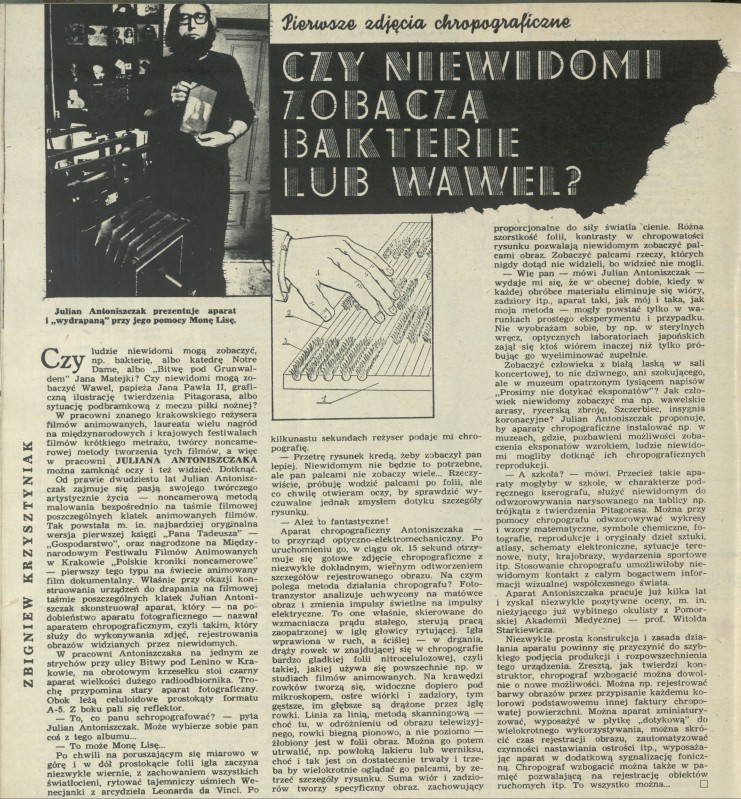 Archiwum / Artykuł nr 2018 (07/1984) 25/313 Podziel się Tytuł Czy niewidomi zobaczą bakterie lub Wawel? Autor Zbigniew Krzysztyniak Kategoria Artykuł Artykuł z numeru 2018 (7/1984) Data wydania 12 lutego 1984 Tagi chropograf niewidomy