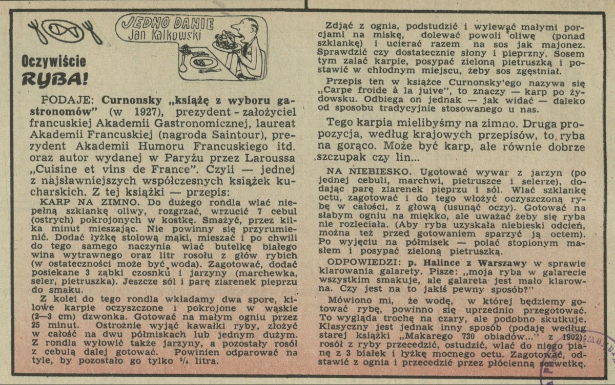 Archiwum / Jedno danie nr 1132-33 (51-52/1966) 1/3 Podziel się Tytuł Oczywiście ryba! Autor Jan Kalkowski Rubryka Jedno danie Artykuł z numeru 1132-33 (51/1966) Data wydania 18 grudnia 1966 Tagi gastronomia kulinaria przepis kulinarny ryba karp galareta