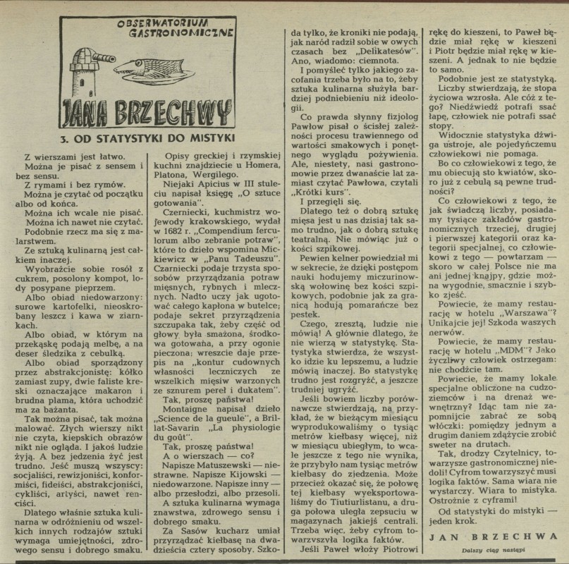 Archiwum / Obserwatorium gastronomiczne Jana Brzechwy nr 642 (31/1957) 25471/123969 Podziel się Tytuł Od statystyki do mistyki Autor Jan Brzechwa Rubryka Obserwatorium gastronomiczne Jana Brzechwy Artykuł z numeru 642 (31/1957) Data wydania 28 lipca 1957 Tagi kulinaria gastronomia sztuka kulinarna statystyka