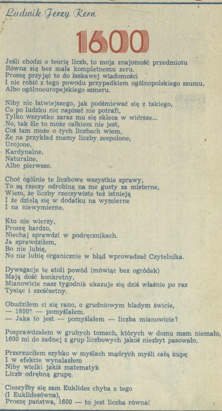 Archiwum / Rozmaitości [old] nr 1600 (49/1975) 04/42 Podziel się Tytuł 1600 Autor Ludwik Jerzy Kern Rubryka Rozmaitości [old] Artykuł z numeru 1600 (49/1975) Data wydania 7 grudnia 1975