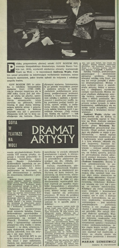 Archiwum / Teatr nr 1619 (16/1976) 68078/123969 Podziel się Tytuł Dramat artysty Autor Marian Sienkiewicz Rubryka Teatr Artykuł z numeru 1619 (16/1976) Data wydania 18 kwietnia 1976 Tagi Gdy rozum śpi teatr teatr na woli