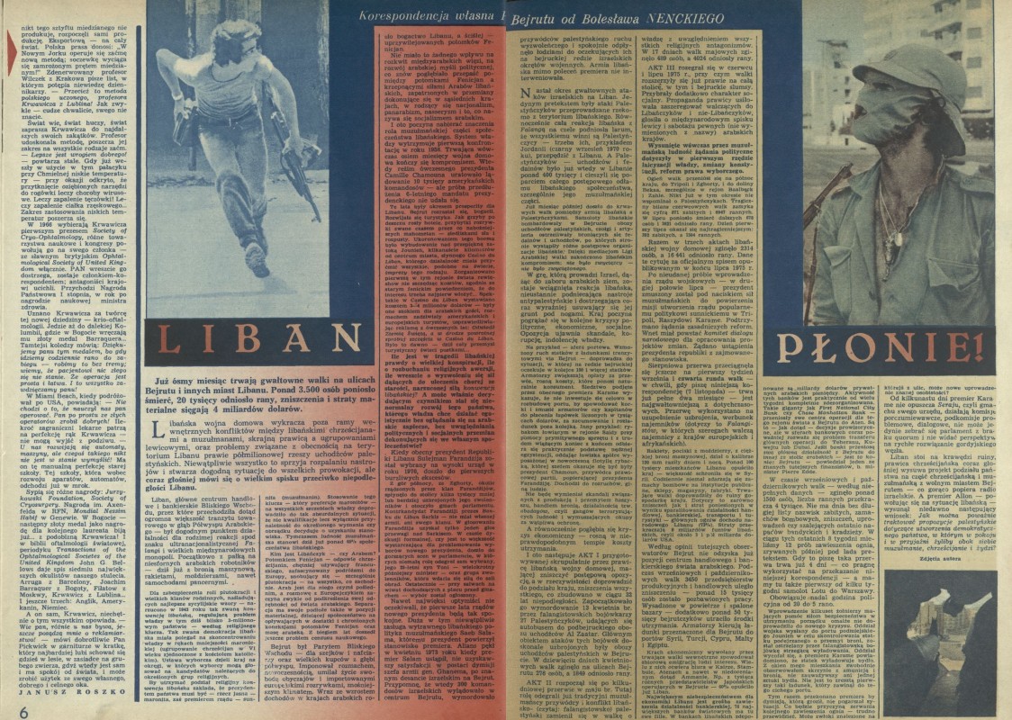 Archiwum / korespondencja własna "Przekroju" nr 1601 (50/1975) 06/10 Podziel się Tytuł Liban płonie! Autor Bolesław Nencki Rubryka korespondencja własna "Przekroju" Artykuł z numeru 1601 (50/1975) Data wydania 14 grudnia 1975