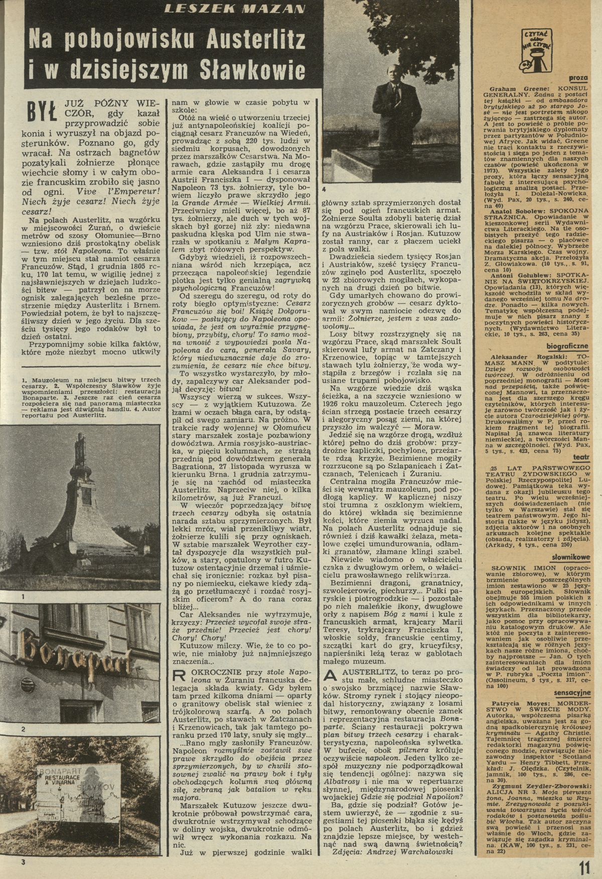 Archiwum / Różności nr 1601 (50/1975) 67232/123969 Podziel się Tytuł Na pobojowisku Austerlitz i w dzisiejszym Sławkowie Autor Leszek Mazan Kategoria Różności Artykuł z numeru 1601 (50/1975) Data wydania 14 grudnia 1975