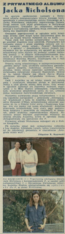 Archiwum / korespondencja własna "Przekroju" nr 1627 (24/1976) 25/76 Podziel się Tytuł Z prywatnego albumu Jacka Nicholsona Autor Zbigniew K. Rogowski Rubryka korespondencja własna "Przekroju" Artykuł z numeru 1627 (24/1976) Data wydania 13 czerwca 1976