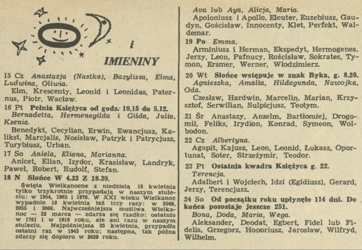 Archiwum / Różności nr 1044-45 (15-16/1965) 43841/123969 Podziel się Tytuł Imiona i imiieniny Kategoria Różności Artykuł z numeru 1044-45 (15/1965) Data wydania 19 kwietnia 1965