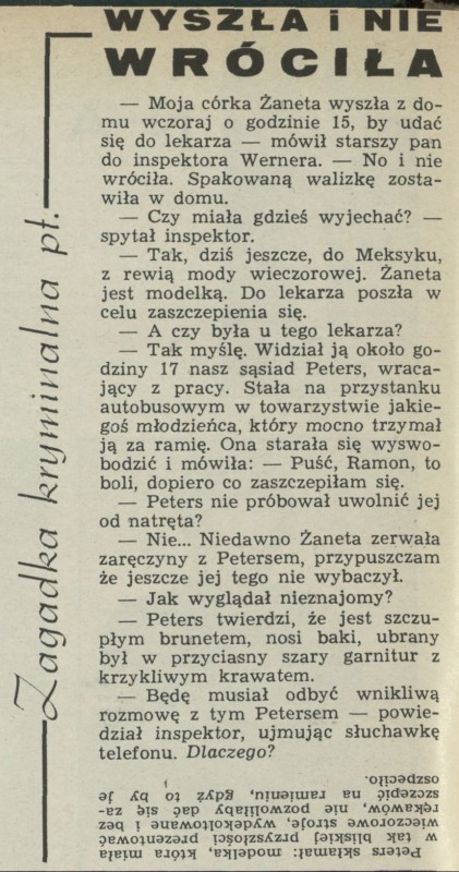 Archiwum / Zagadka kryminalna nr 1609 (06/1976) 284/1933 Podziel się Tytuł Zagadka kryminalna Rubryka Zagadka kryminalna Artykuł z numeru 1609 (6/1976) Data wydania 8 lutego 1976