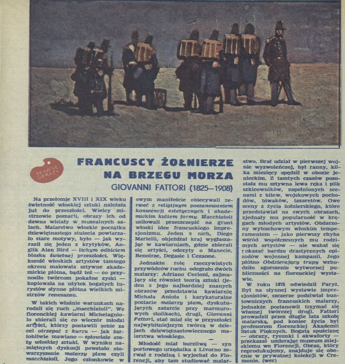Archiwum / Sławne obrazy nr 1584 (33/1975) 66882/123969 Podziel się Tytuł Sławne obrazy – „Francuscy żołnierze na brzegu morza” Autor Wer. Rubryka Sławne obrazy Artykuł z numeru 1584 (33/1975) Data wydania 17 sierpnia 1975 Tagi sztuka obraz Giovanni Fattori malarstwo