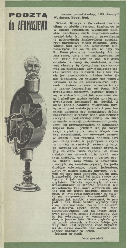 Archiwum / Pocztą od Afanasjewa nr 1584 (33/1975) 41/45 Podziel się Tytuł Pocztą do Afanasjewa Autor Lord Paradox Rubryka Pocztą od Afanasjewa Artykuł z numeru 1584 (33/1975) Data wydania 17 sierpnia 1975 Tagi listy reakcja komentarze nadesłane