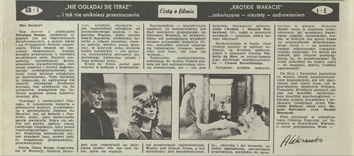 Archiwum / Listy o filmie nr 1584 (33/1975) 3/7 Podziel się Tytuł Nie oglądaj się teraz i Krótkie wakacje Autor Aleksandra Rubryka Listy o filmie Artykuł z numeru 1584 (33/1975) Data wydania 17 sierpnia 1975 Tagi film kinematografia repertuar recenzja nowości aktorzy gwiazdy