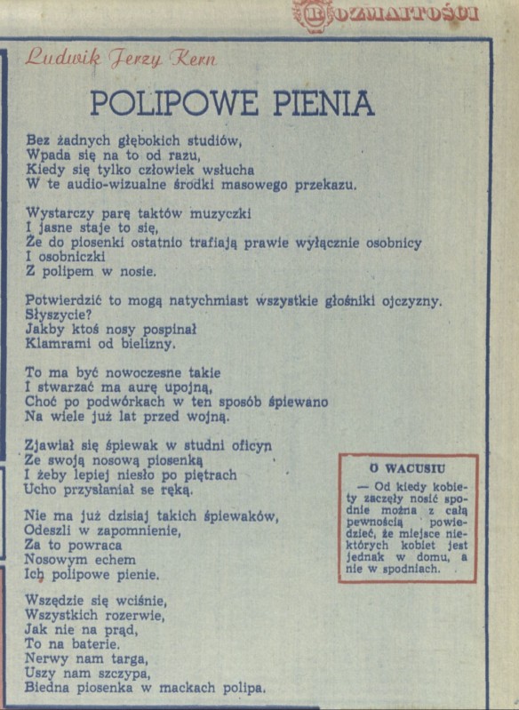 Archiwum / Rozmaitości [old] nr 1584 (33/1975) 66911/123969 Podziel się Tytuł Polipowe pienia Autor Ludwik Jerzy Kern Rubryka Rozmaitości [old] Artykuł z numeru 1584 (33/1975) Data wydania 17 sierpnia 1975 Tagi wiersz poezja