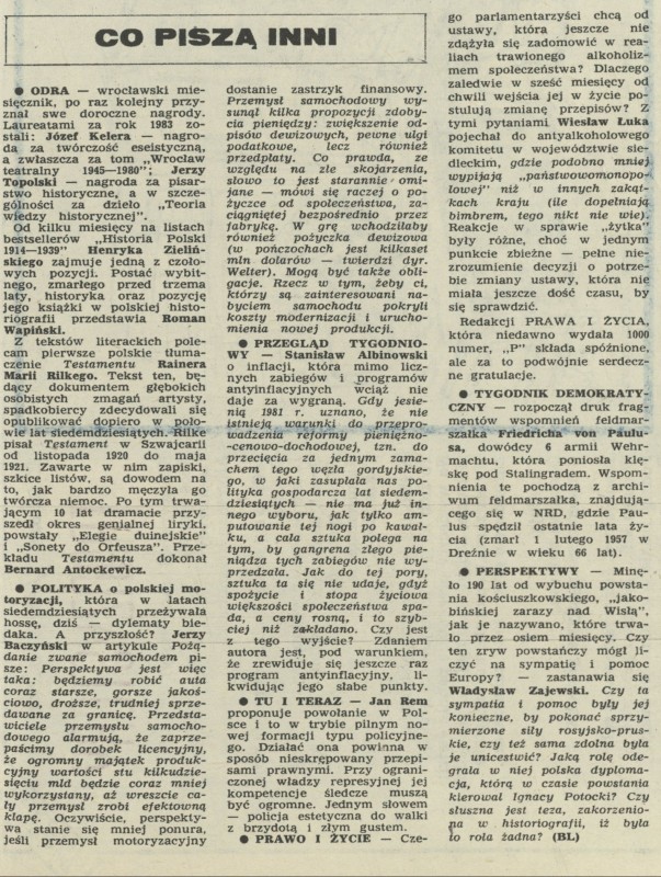 Archiwum / Co piszą inni nr 2024 (13/1984) 147/283 Podziel się Tytuł Co piszą inni Autor bł Rubryka Co piszą inni Artykuł z numeru 2024 (13/1984) Data wydania 25 marca 1984