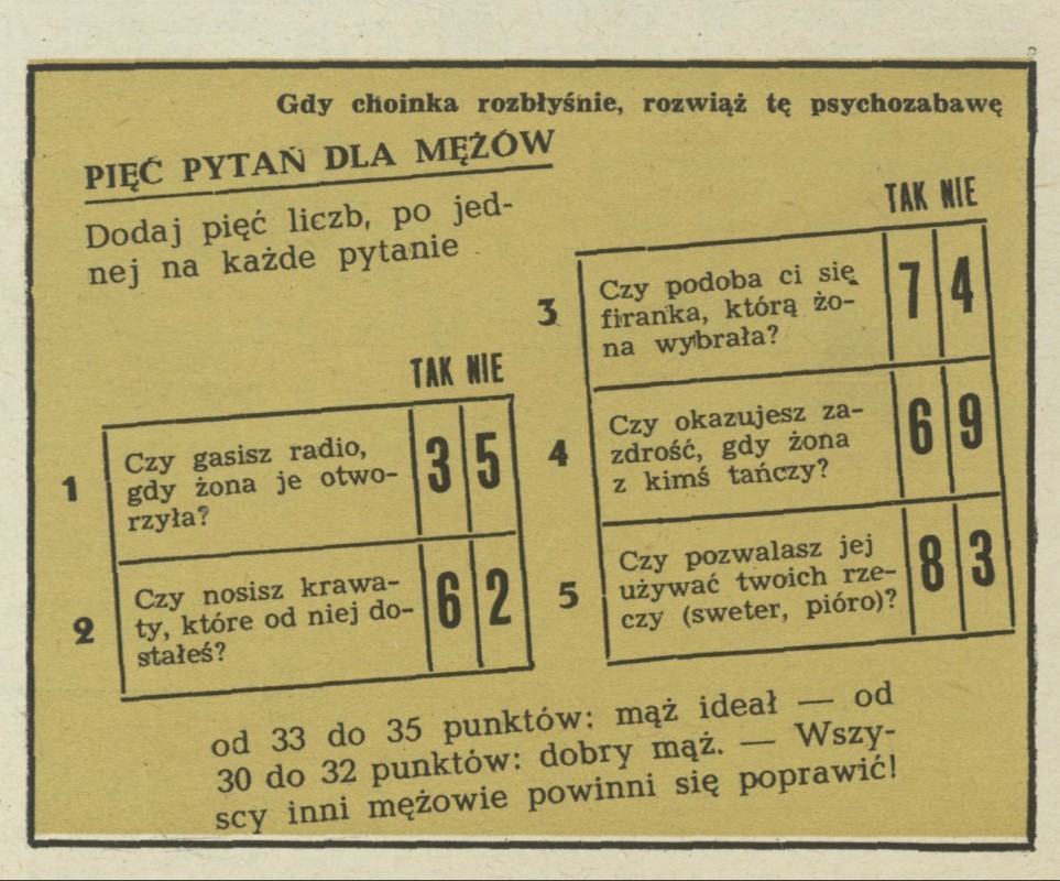 Archiwum / Psychozabawa nr 818-20 (50-52/1960) 06/24 Podziel się Tytuł Pięć pytań dla mężów Rubryka Psychozabawa Artykuł z numeru 818-20 (50/1960) Data wydania 11 grudnia 1960