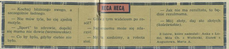 Archiwum / Heca hecą nr 1521 (22/1974) 214/1313 Podziel się Tytuł Heca Hecą Rubryka Heca hecą Artykuł z numeru 1521 (22/1974) Data wydania 1 czerwca 1974