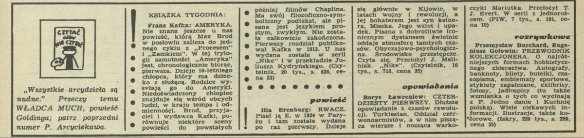 Archiwum / Czytać albo nie czytać? nr 1145-46 (12-13/1967) 3/3 Podziel się Tytuł Czytać albo nie czytać? Rubryka Czytać albo nie czytać? Artykuł z numeru 1145-46 (12/1967) Data wydania 19 marca 1967 Tagi Franz Kafka: Ameryka