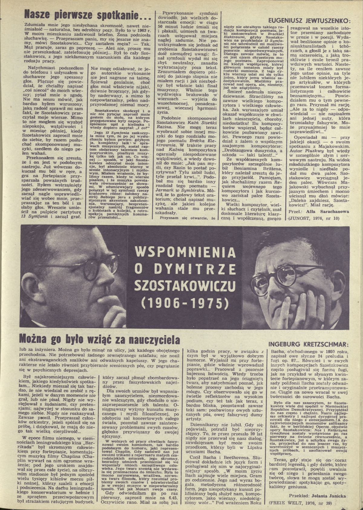 Archiwum / Artykuł nr 1649 (46/1976) 16237/23034 Podziel się Tytuł Wspomnienia o Dymitrze Szostakowiczu Autor Jolanta Janicka Kategoria Artykuł Artykuł z numeru 1649 (46/1976) Data wydania 14 listopada 1976 Tagi ludzie