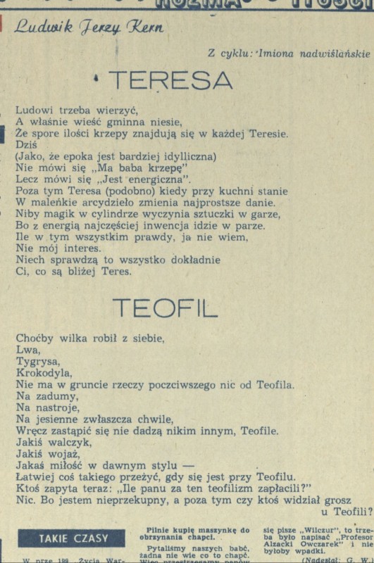 Archiwum / Poezja nr 1645 (42/1976) 68919/123969 Podziel się Tytuł Teresa Autor Ludwik Jerzy Kern Kategoria Poezja Artykuł z numeru 1645 (42/1976) Data wydania 17 października 1976