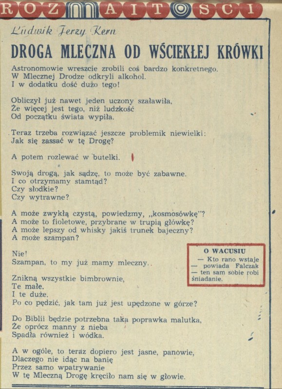 Archiwum / Poezja nr 1664 (09/1977) 1/2 Podziel się Tytuł Droga mleczna od wściekłej krówki Autor Ludwik Jerzy Kern Kategoria Poezja Artykuł z numeru 1664 (9/1977) Data wydania 27 maja 1977