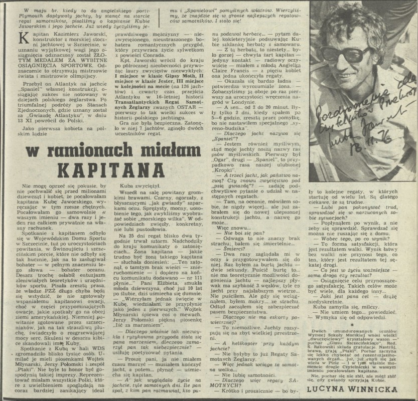 Archiwum / Sport nr 1652 (49/1976) 69237/123969 Podziel się Tytuł W ramionach miałam kapitana Autor Lucyna Winnicka Rubryka Sport Artykuł z numeru 1652 (49/1976) Data wydania 5 grudnia 1976 Tagi Kazimierz „Kuba” Jaworski żeglarstwo regaty Order Odrodzenia Polski Polonia Restituta