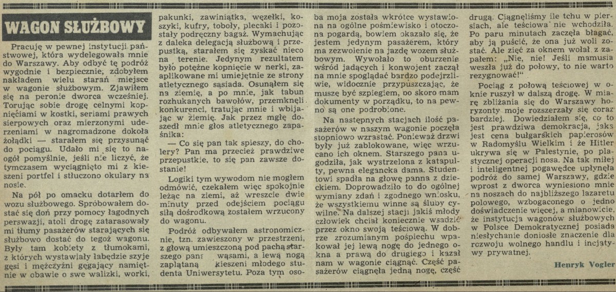 Archiwum / Felieton nr 42 (04/1946) 111/1682 Podziel się Tytuł Wagon służbowy Autor Henryk Vogler Kategoria Felieton Artykuł z numeru 42 (4/1946) Data wydania 27 stycznia 1946 Tagi kolej