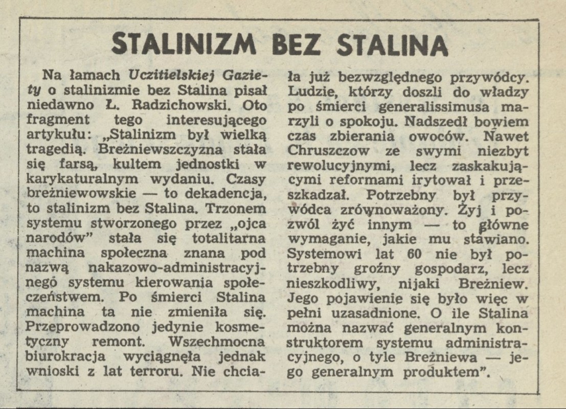 Archiwum / Społeczeństwo nr 2259 (39/1988) 6/8 Podziel się Tytuł Stalinizm bez Stalina Kategoria Społeczeństwo Artykuł z numeru 2259 (39/1988) Data wydania 25 września 1988 Tagi Józef Stalin stalinizm Chruszczow Nikitaa