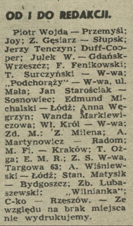 Archiwum / Listy do i od redakcji nr 40 (02/1946) 02/117 Podziel się Tytuł Od i do redakcji. Rubryka Listy do i od redakcji Artykuł z numeru 40 (2/1946) Data wydania 11 stycznia 1946 Tagi niewydrukowane listy