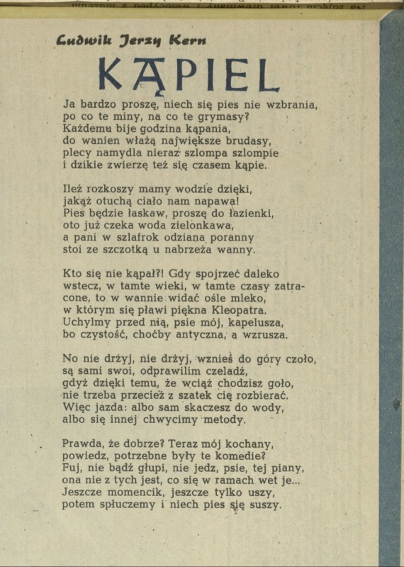 Archiwum / Rozmaitości [old] nr 706 (42/1958) 956/4388 Podziel się Tytuł „Kąpiel” Autor Ludwik Jerzy Kern Rubryka Rozmaitości [old] Artykuł z numeru 706 (42/1958) Data wydania 19 października 1958 Tagi pies brudas pani szczotka wanna Kleopatra czystość piana fuj