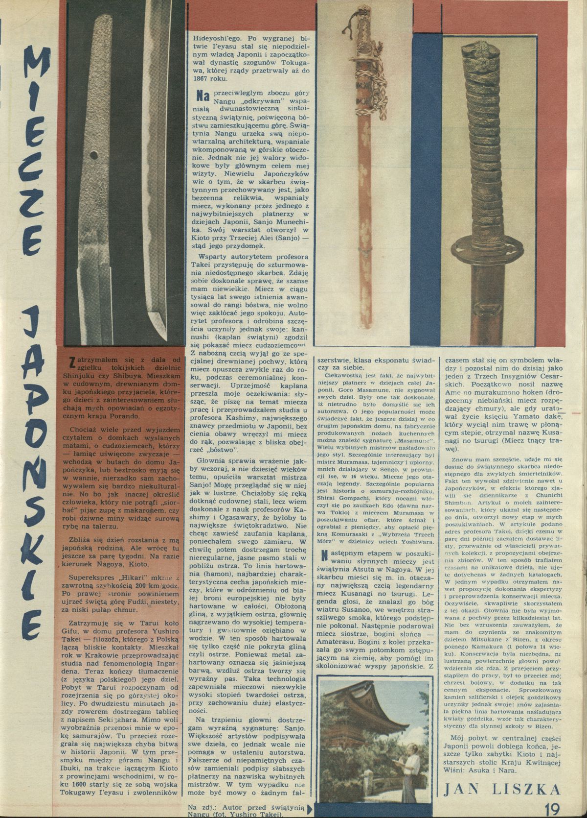 Archiwum / Społeczeństwo nr 1781 (21/1979) 74676/123969 Podziel się Tytuł Miecze japońskie Autor Jan Liszka Kategoria Społeczeństwo Artykuł z numeru 1781 (21/1979) Data wydania 27 maja 1979