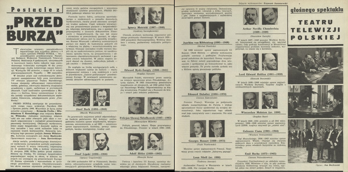Archiwum / Artykuł nr 1685 (30/1977) 152/298 Podziel się Tytuł Postacie z „Przed Burzą” Autor Jan Buchwald Zygmunt Januszewski Kategoria Artykuł Artykuł z numeru 1685 (30/1977) Data wydania 24 lipca 1977 Tagi Mościcki Hitler Rydz-Śmigły Ribbentrop Daladier Chamberlain Ciano Teatr Telewizji Polskiej