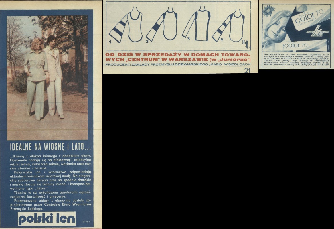 Archiwum / Reklamy nr 1519 (20/1974) 63571/123969 Podziel się Tytuł Reklama w Przekroju Rubryka Reklamy Artykuł z numeru 1519 (20/1974) Data wydania 19 maja 1974 Tagi Polski Len Dom Towarowy Pollena-Color