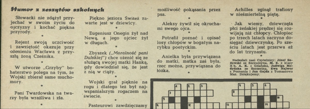 Archiwum / Humor zeszytów szkolnych nr specjalny 1/1961 31/32 Podziel się Tytuł Humor z zeszytów szkolnych Rubryka Humor zeszytów szkolnych Artykuł z numeru nr specjalny 1/1961 Data wydania 1 grudnia 1961