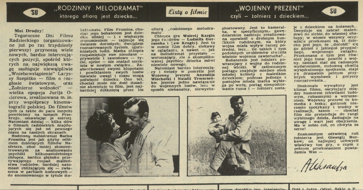 Archiwum / Listy o filmie nr 1700 (45/1977) 355/445 Podziel się Tytuł Rodzinny melodramat, Wojenny prezent Autor Aleksandra Rubryka Listy o filmie Artykuł z numeru 1700 (45/1977) Data wydania 6 listopada 1977