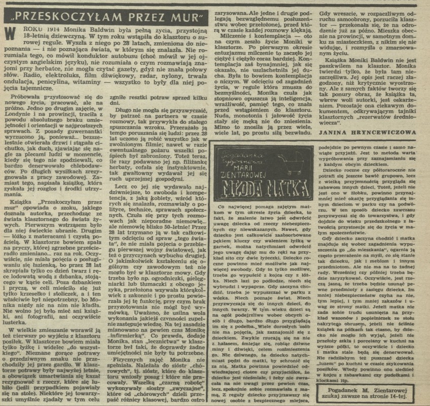 Archiwum / Książki nr 429 (26/1953) 216/1024 Podziel się Tytuł ,,Przeskoczyłam przez mur" Autor Janina Hrycewiczowa Rubryka Książki Artykuł z numeru 429 (26/1953) Data wydania 28 czerwca 1953 Tagi Monika Baldwin zakon klasztor