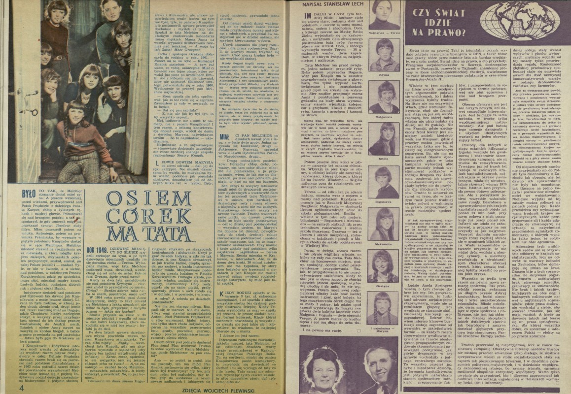 Archiwum / Artykuł nr 1654-55 (51-52/1976) 1896/1933 Podziel się Tytuł Osiem córek ma tata Autor Stanisław Lech Kategoria Artykuł Artykuł z numeru 1654-55 (51/1976) Data wydania 19 grudnia 1976